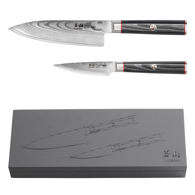 The YARI Series is a bold statement of traditional design coupled with innovative materials. Exceptionally sharp, and striking in design, these hand-sharpened blades feature a unique 67-layer Damascus pattern across the face of the X-7 high-alloy full-tang blades. Rich, ultra-dense gray G10 handles balance each knife while providing exceptional comfort and precision for the chef.This knife set comes with a rich gray woodbox that is perfectlysuited to protect both knives.