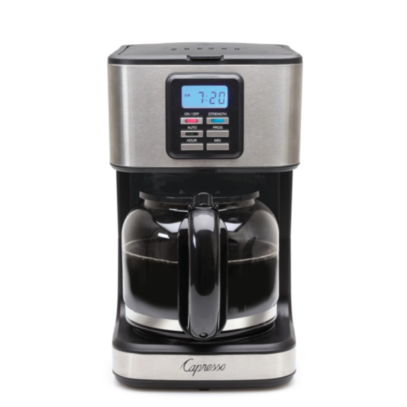 Compact and stylish, the SG220 is a fully sized 12-Cup coffee maker designed to save you space on the countertop. An easy-to-read external water level indicator and fully programmable LCD display makes brewing rich, hot coffee a snap. The reusable GoldTone filter and glass carafe with brew though lid and drip-free pouring spout are dishwasher safe, making clean-up a breeze. The optional strength setting extends the brew time for added aroma.