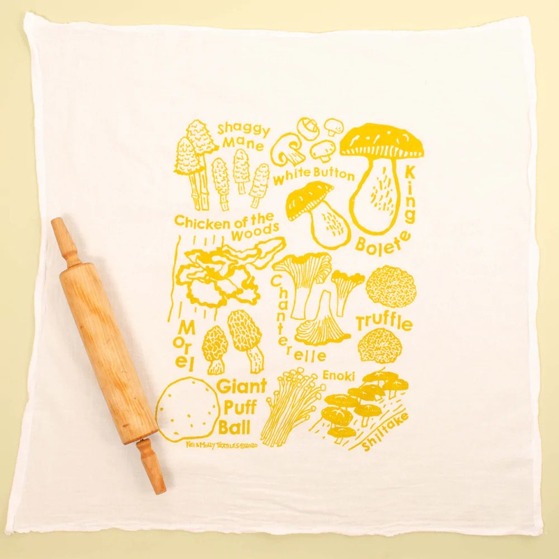 For the love of Mushrooms! Fromrestaurant tastings, to wild mushroom foraging, mushrooms have become the newest trend. There are even highly paid trained hounds rooting for these delicacies. Our Mushroom flour sack dish toweldepictsa variety of these delicious delights. Featuring all different species of mushrooms, from the bright orange Beacon, the Chicken of the Woods, to the decadent Truffle Mushroom. Wrap your picnic up in this soft, light weight tea towel or spruce up your kitchen with a splash of gold!