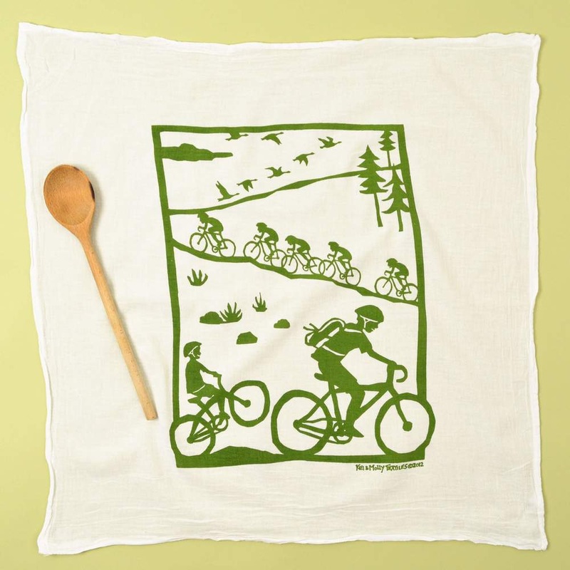 This hand-printed flour sack dish towel makes a wonderful gift for anyone who loves to cycle, or if your Dad has ever taken you for a ride, this makes a perfect Father’s Day gift! If you prefer to keep it for yourself, hang it on your oven door for some outdoor inspiration!