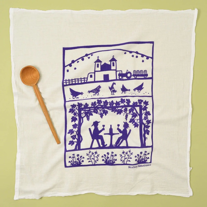 Our Vineyard design invites you to take time out, sip some wine and enjoy your surroundings. Don’t you want to hop inside of this design and enjoy the summer breeze on the Vineyard? When you think of Vineyards, California or perhaps Spain come to mind, but a vineyard in the desert? Yes, surprisingly there are several vineyards here in New Mexico and they are quite beautiful! Every Spring we have several wine festivals around the state, featuring wines from our desert land. The church depicted on this cotton towel is the Church of Chimayo, a favorite pilgrimage destination known for its healing soil.