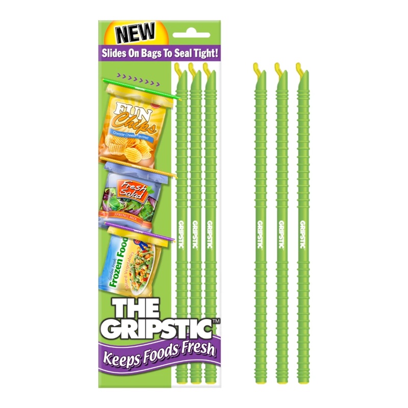 THE GRIPSTIC is the best chip clip device ever made. Ourpatented slide and seal technology locks in freshness by sealing the entire bag air tight.This reusable sealing rod locks air and moisture out to prevent your chips, pretzels, snacks, cereal from goin