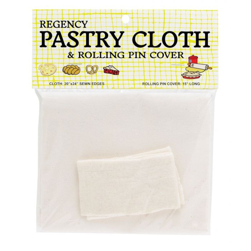 Pastry cloth: 20" x 24"Rolling pin cover: 15" long100% Cotton