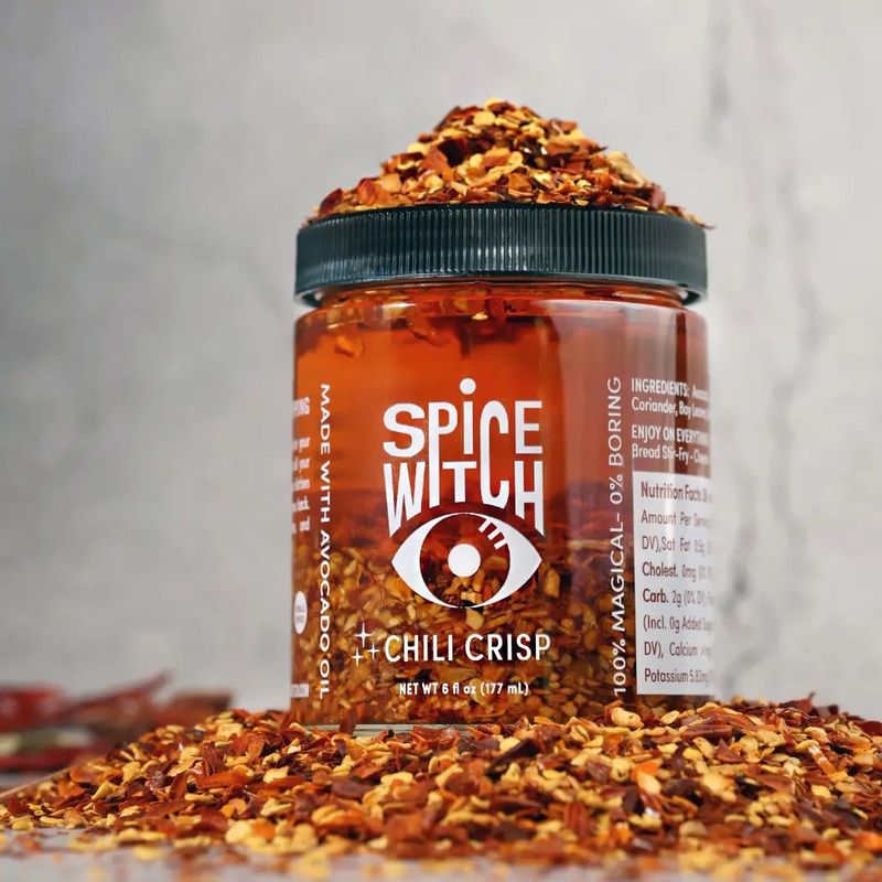 Introducing Spice Witch Chili Crisp, a magical condiment made with avocado oil infused with garlic, ginger, and a variety of spices. It features crispy bits at the bottom and is perfect for enhancing rice bowls, ramen, veggies, and protein dishes.